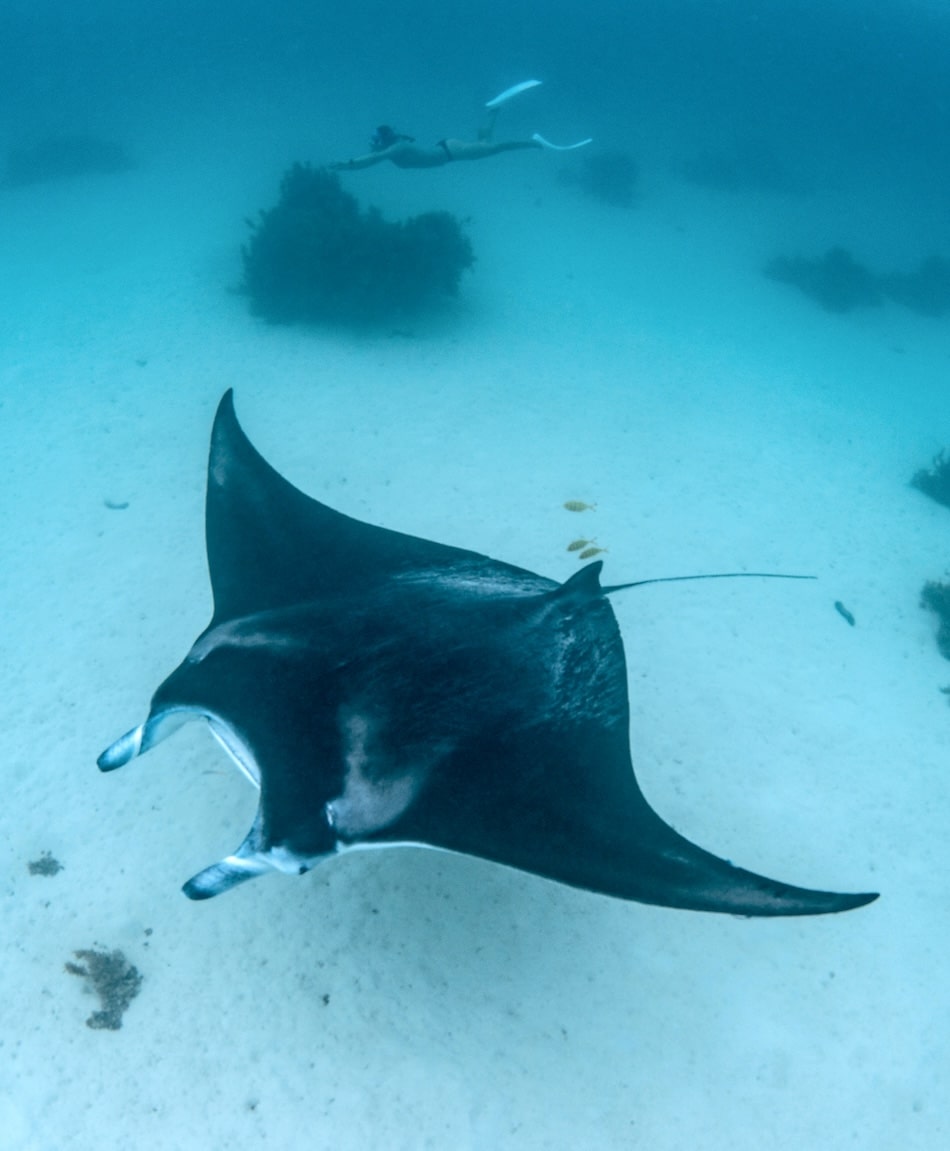 Mantas are the world’s largest rays, the coastal Manta Rays we encounter can grow up to 4.5m from wing tip to wing tip. They have no stinging barb in their tail like their cousins, therefore are harmless, with only their size and speed as defensive weapons. They are very smart animals and will at times check US out, which is an amazing experience to receive.